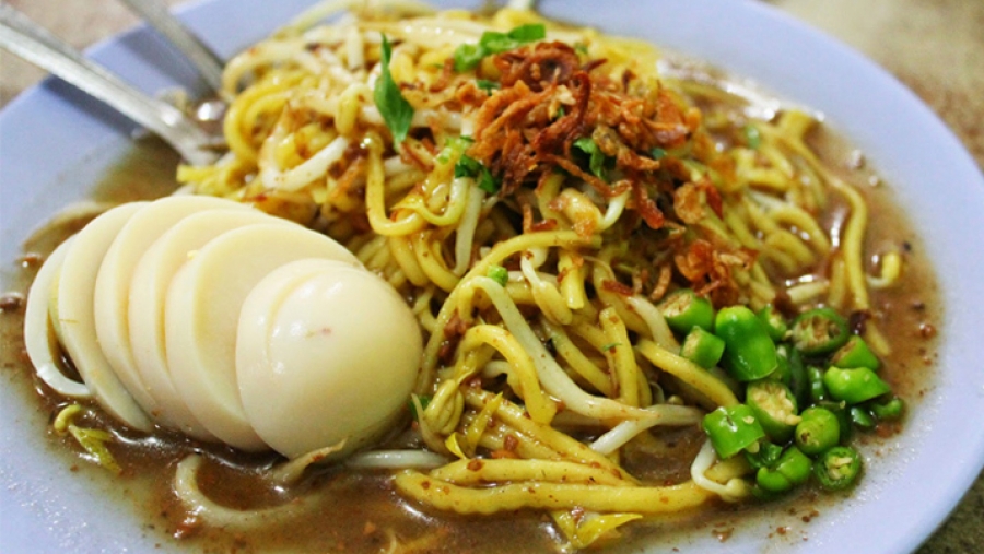 biasanya dimakan dengan telur rebus. Kuah mi ini kental berbahan kacang tanah,